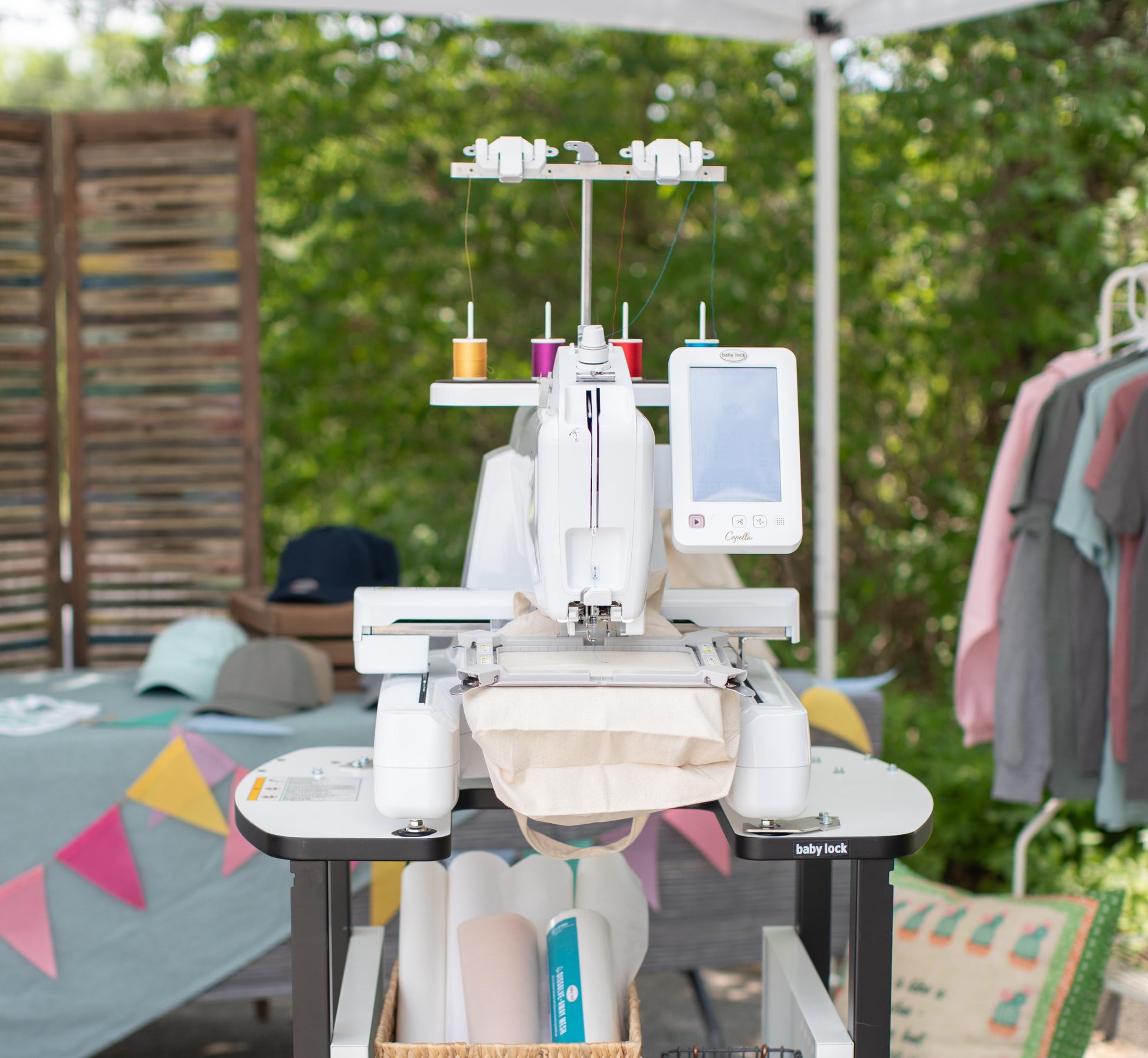 The Baby Lock Capella single-needle, free-arm embroidery machine is ideal for your small embroidery business. Its crosshair positioning laser allows for perfect embroidery design placement, and the free-arm also provides ease and effectiveness when embroidering in tight areas such as inside pockets and sleeves. It can even embroider on stuffed animals, tote bags, and hats!