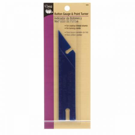 A combination tool. Use one end to push out points on collars, lapels, cuffs, pockets and belts. The other end is a button gauge that slips under the button as you sew to form a thread shank. Use the smaller gauge for lightweight fabrics and the large.
